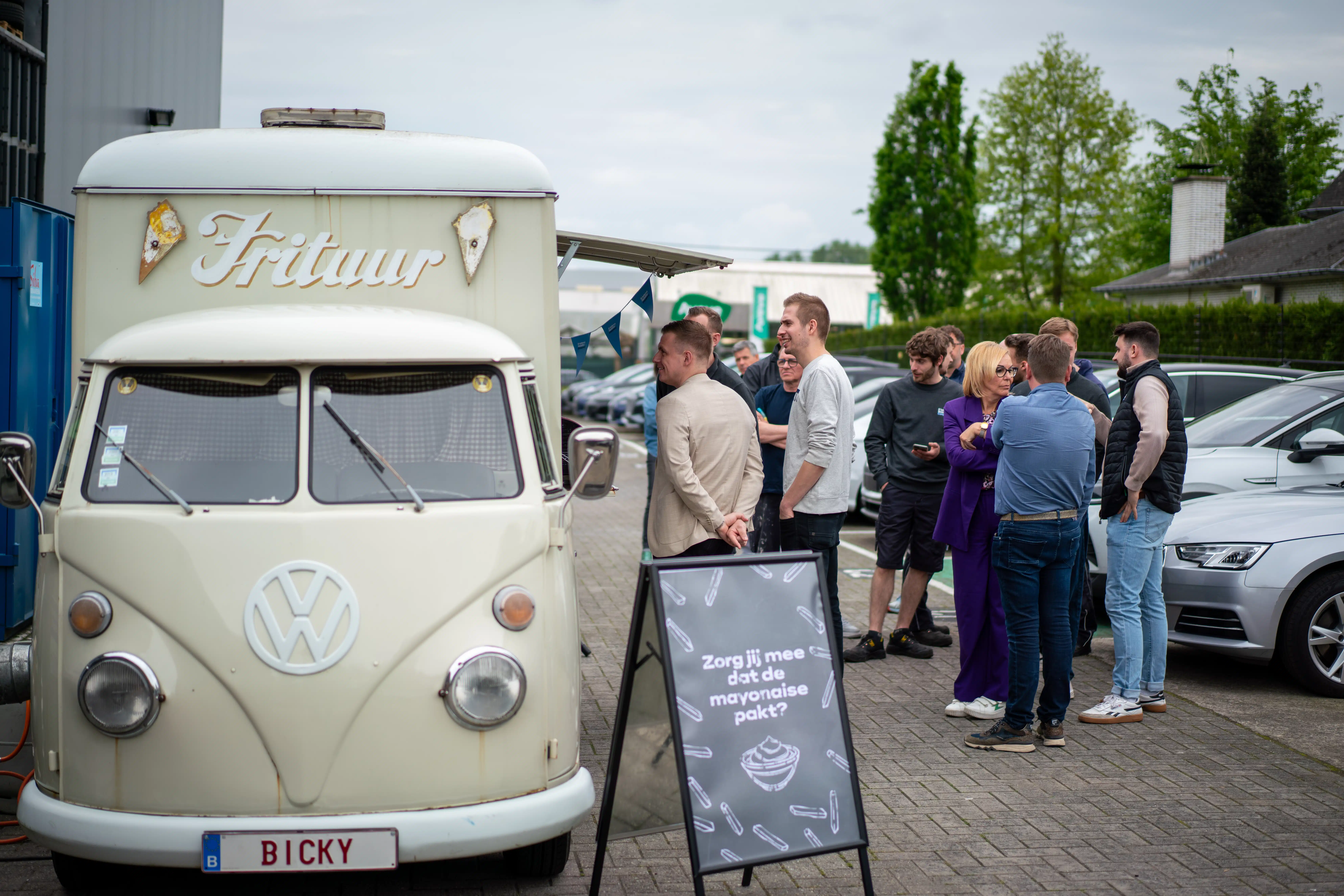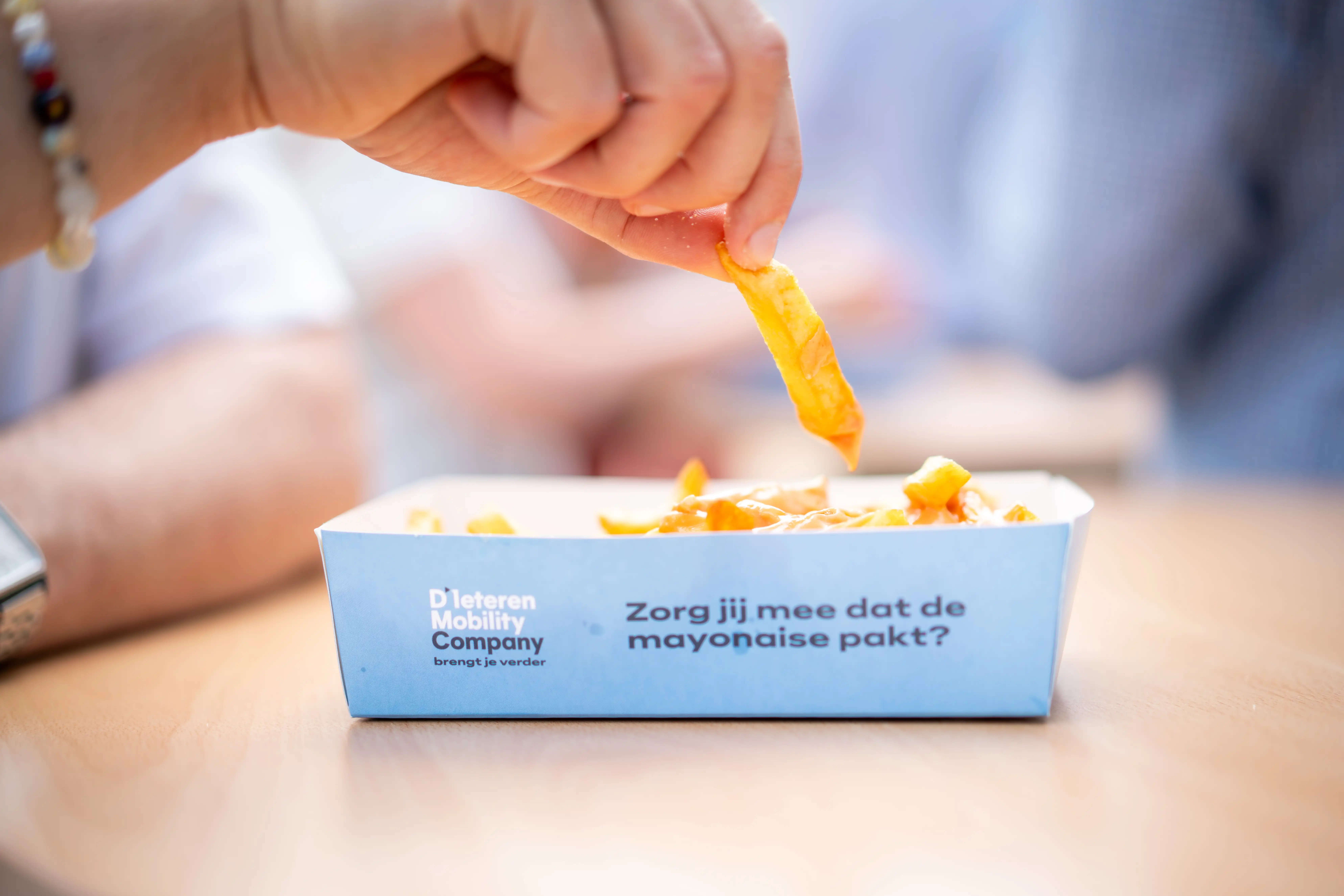 Tijdens de lunchmomenten combineerden we frietjes met inspirerende speeches en gesprekken over de toekomst van D’Ieteren Mobility Company. Open, laagdrempelig en menselijk: exact wat nodig is om de visie te laten landen. Terwijl ze konden genieten van een frietje, kregen medewerkers de kans om hun ideeën te delen.